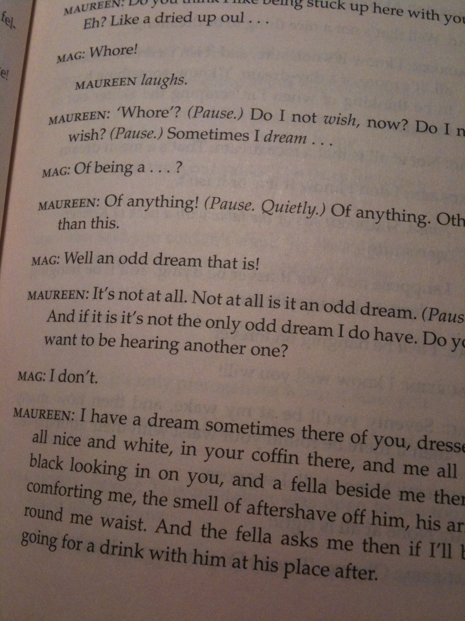 Last night we broke our usual routine and went out in the appropriately cold and rainy night to see The Beauty Queen of Leenane at the Langham Court Theatre. This post is not a review, but it is a response, which I feel to write partly because I’m currently enjoying writing responses, and partly because I am curious about my response to the play. So you know, reviews of this production have been favourable.